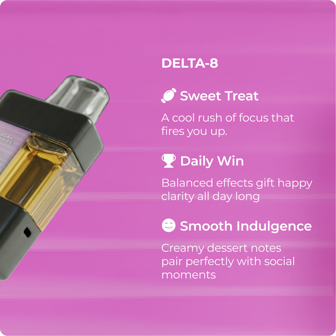 Celebrate every moment as Birthday Cake Haze blends sweet vanilla euphoria, uplifting energy, and sugary dessert vibes in a smooth, easy 3‑gram vape.