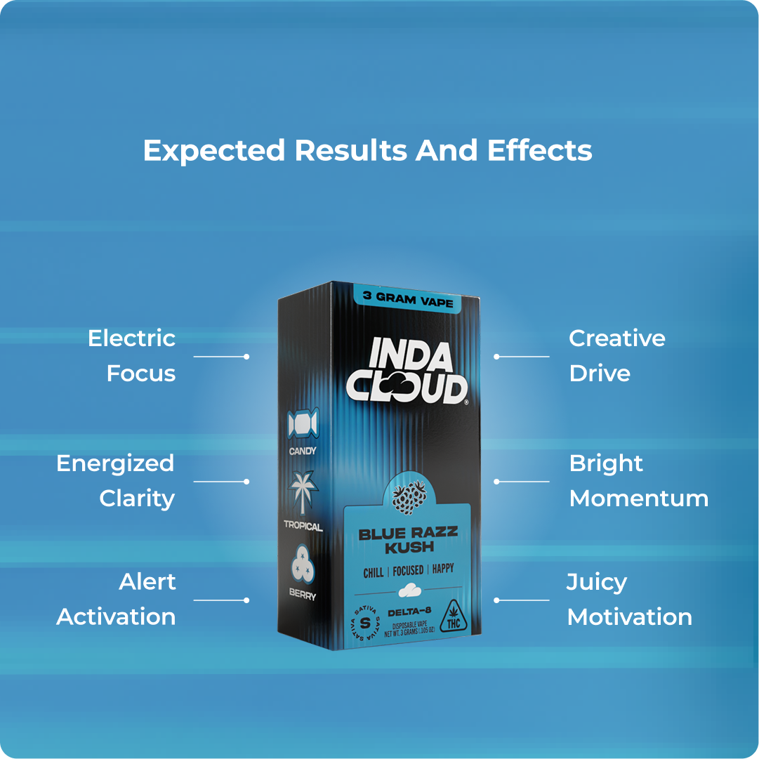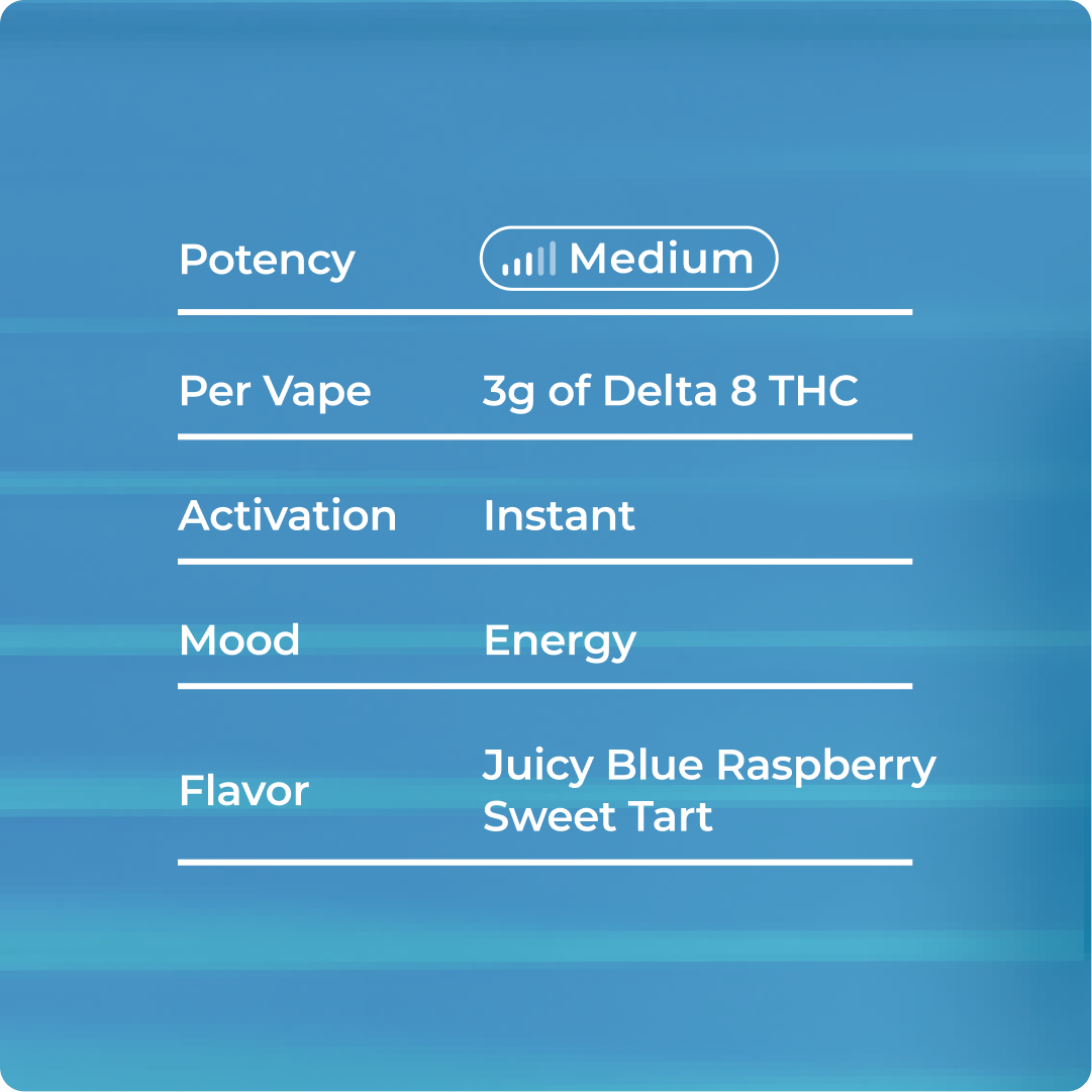 Bold blue-raspberry flavor meets sharp, uplifting Delta 8. Blue Razz Kush delivers energizing clarity and focused buzz in a seamless 3‑gram cartridge experience.