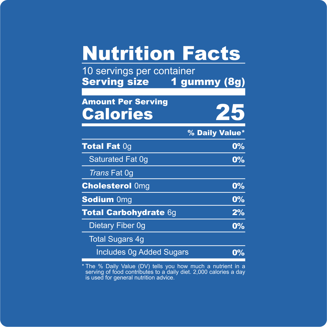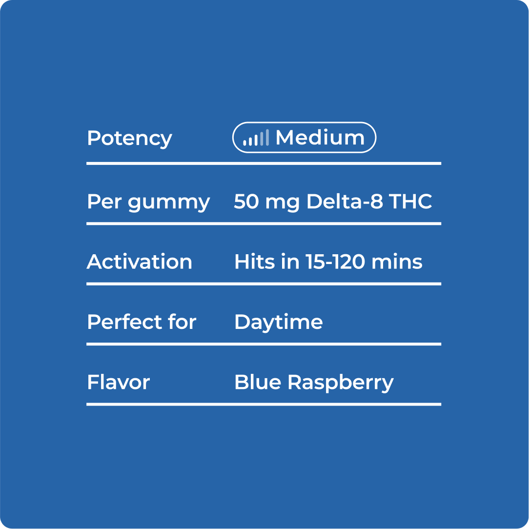 Each Blue Razz Retreat Delta 8 Gummy contains a potent concentration of 50mg of Delta 8 distillate. This dosage has been carefully chosen to ensure you receive the full benefits of Delta 8 THC, providing a rich and enjoyable experience with every gummy. In addition, the potency makes these gummies suitable for those with previous experience with Delta 8 or other forms of THC.