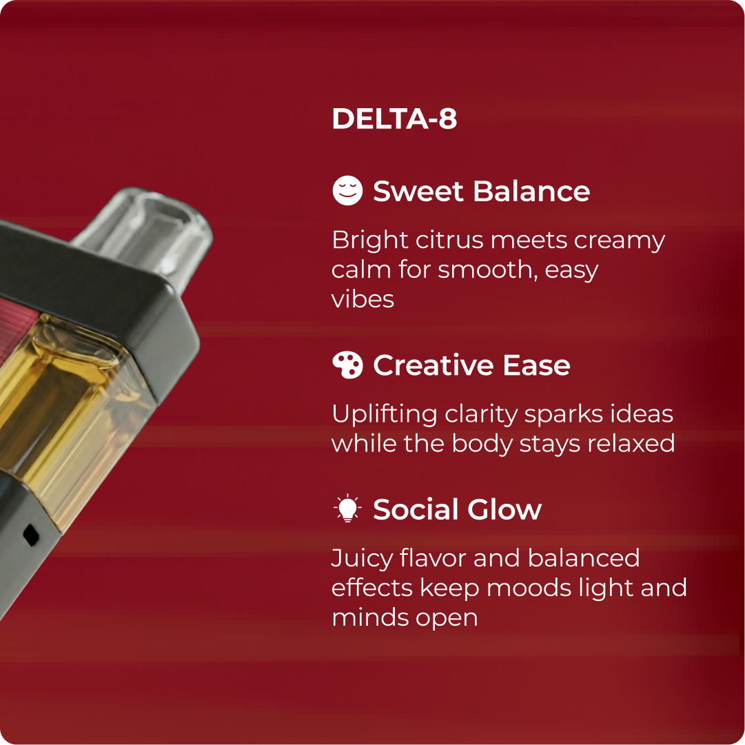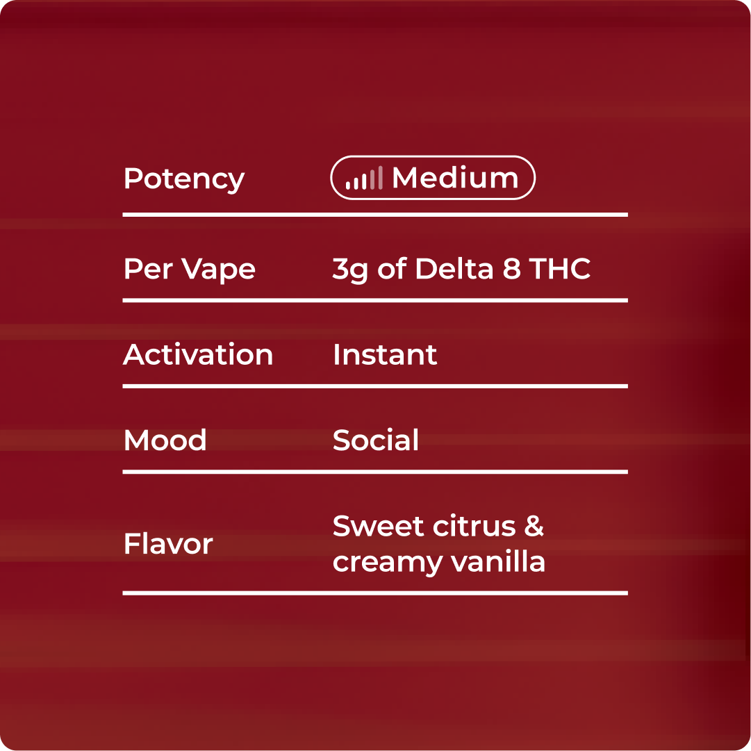 Sweet citrus and creamy dessert notes combine with a balanced Delta 8 experience as Gelato 33 brings uplifting quality, mellow relaxation, and juicy flavor in a sleek, 3g vape.