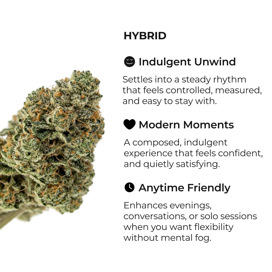 A modern hybrid, Jealousy delivers smooth body ease with a calming headspace. Balanced yet indulgent, it’s ideal for unwinding without losing any edge.