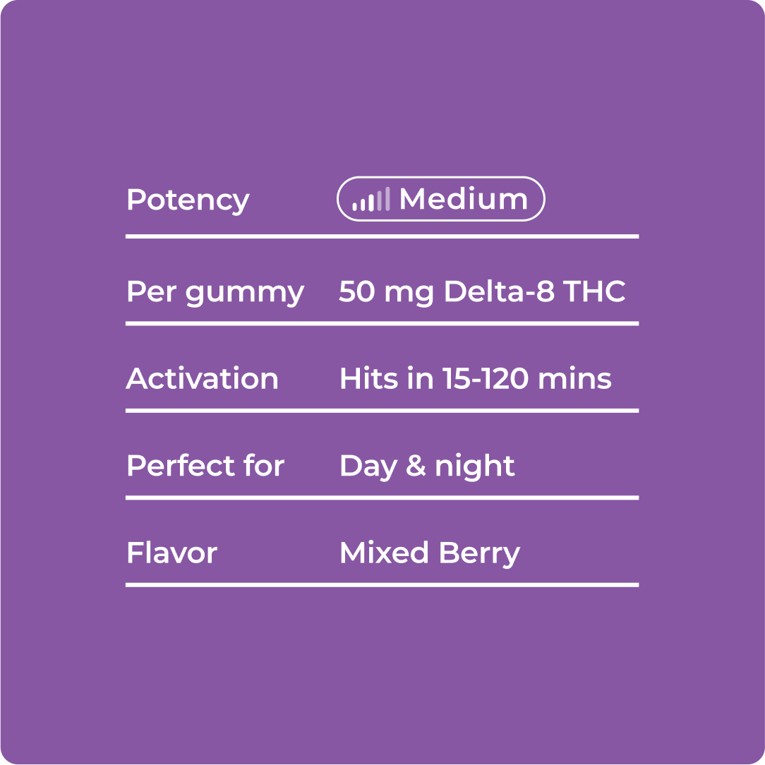 All of the ingredients in Mixed Berry Beach Delta 8 Gummies were handpicked for their efficacy and taste. These gummies feature a fruit infusion and pure Delta 8 THC extracted from hemp. These are mixed utilizing cutting-edge formulation methods to ensure the highest quality of each component and the most potent possible gummy experience. Multi-stage laboratory testing performed both before and after production have confirmed the substances' safety and purity. Also, these gummies are subjected to rigorous quality control processes to ensure they meet or exceed all applicable regulations.