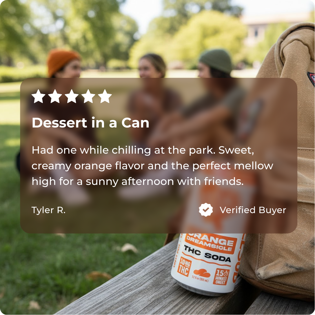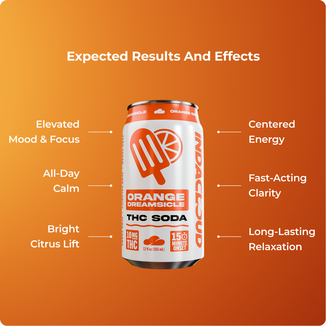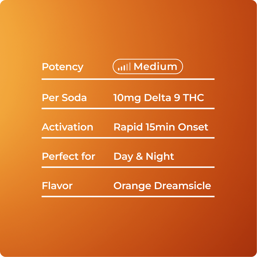 Refreshing orange-vanilla soda crafted for light, sociable euphoria. Zero sugar, quick onset, and silky balance that turns any moment into golden-hour calm.