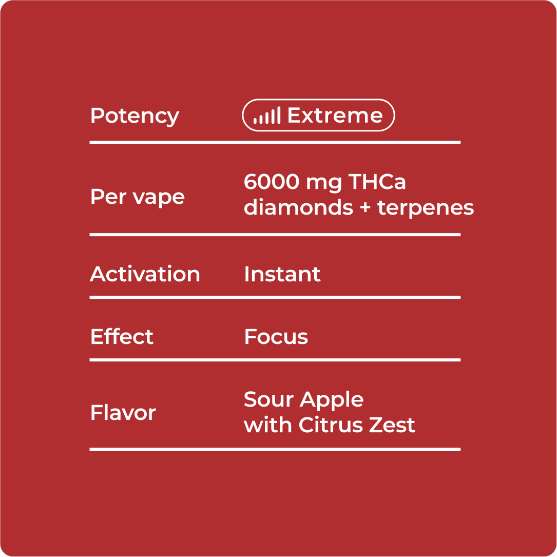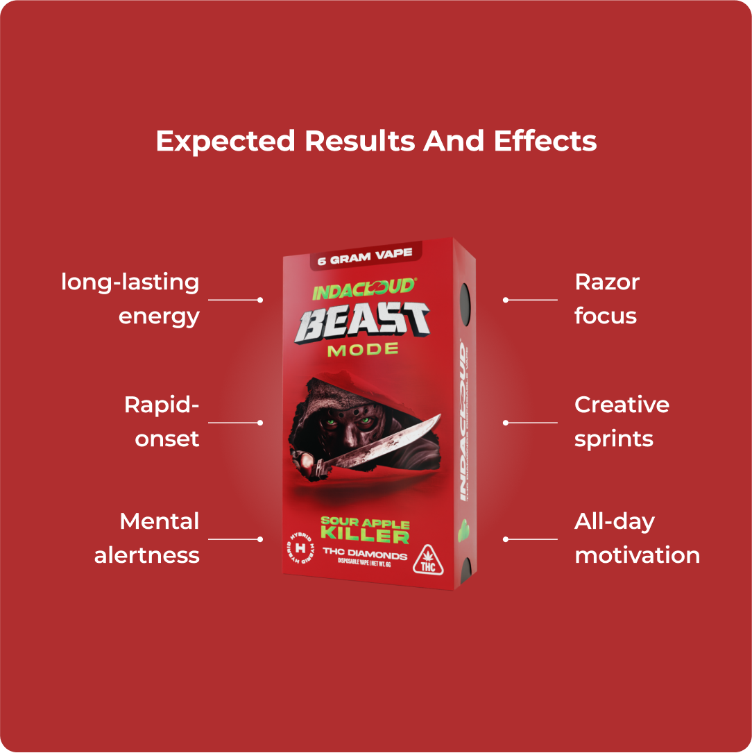 Bright sour-apple citrus meets long-lasting clarity as Sour Apple Killer Beast Mode delivers energetic focus, tart flavor, and potent sativa vibes in a powerful 6 g disposable THCA vape.
