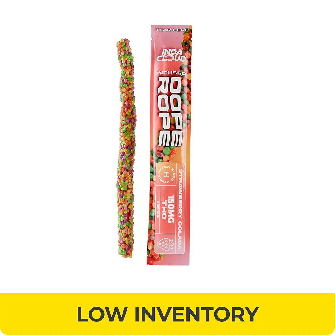 Introducing the Dope Rope, a blast from your past! This candy pebble covered treat boasts 150mg of Delta 9 and Delta 8 THC. Crafted in three flavors, Fruit Punch, Strawberry Colada, and Blue razz, it’s the perfect edible to get you absolutely baked. Be sure to dose accordingly, 150 mg makes the Dope Rope our strongest edible yet so we recommend you start with pieces no larger than ⅛